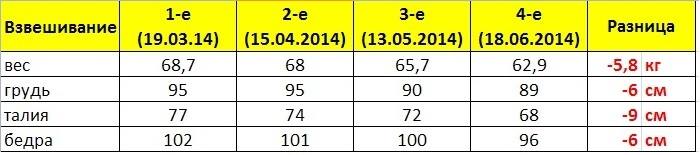 "Занималась 3 раза в неделю фитнесом в студии Glamshape Лесной (силовые тренировки: степ, фитбол, функционалка) и 3 раза полденсом в студии на Театральной. Что касается питания: не ела сладкого, мучного и после 18:00; старалась ограничивать себя в жареном и жирном. Из фруктов и ягод в основном употребляла яблоки и грейпфруты, а не бананы и виноград. 1,5 л обычной воды без газа в день - это уже привычка! Никакого пива, сладких газированных напитков, по типу кока колы и тп каждый вечер. Ну а вообще, мне кажется, главный залог успеха - огромное желание работать над собой и стремление быть лучше чем вчера!))"